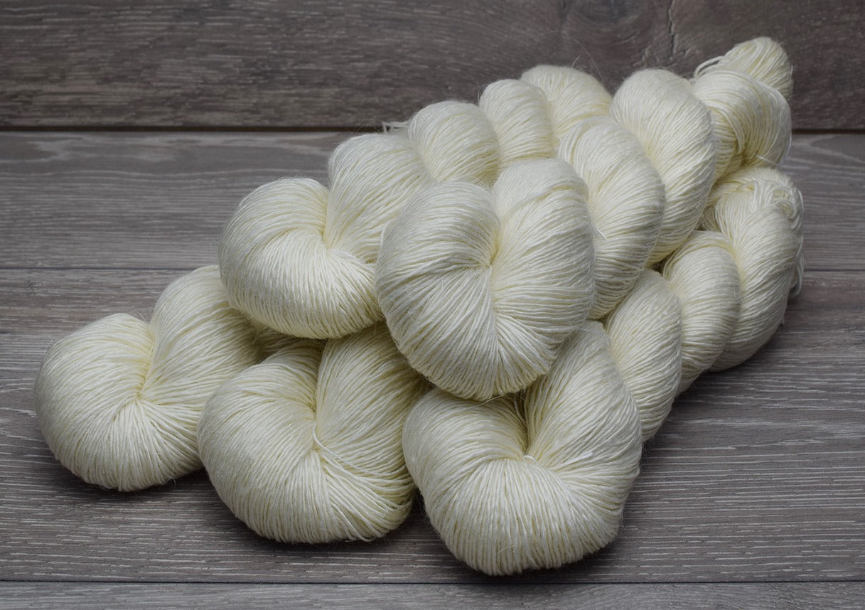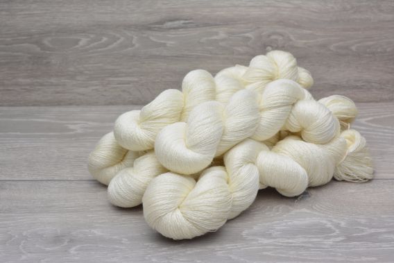 Ultrafine merino is as fine as cashmere and is the finest grade of merino commercially available. Only 3.5% of merino fibre in the world is fine enough to be graded as ultrafine.This batch of merino is not only ultra-soft, but also long staple for added strength and less pilling. Mulberry silk has been added for drape and lustre and some cashmere for that fuzzy halo only cashmere can provide.The yarn has 2 plies and a medium twist. This combination allows room for the cashmere fibres to bloom and the merino fibres to plump up and support them. It is ideal for lace as the 2 plies roll away from each other to open up the lacework and reveal the pattern. This yarn likes a needle size of 3.25mm for a plump and cosy fabric or 3.75mm and above for a light and barely there feel.