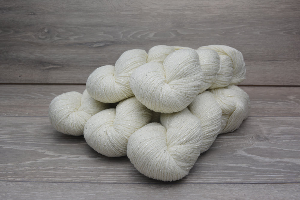 Description: Three plies of merino/nylon are spun with a ply of lurex for a soft, durable yarn with sparkle. We spent a lot of time working with our spinners to get the blend just right for "Stardust". There is enough lurex to add sparkle, without the scratchiness often associated with lurex yarns, and extrafine merino for a soft handle. Add nylon and you have durability too.